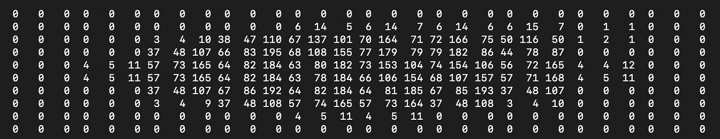 To start with, we can rearrange this long 1D list of numbers into 2D. Now the numbers we're examining are all in the position that roughly corresponds to the actual position of that color in the image. The numbers in the top left correspond to the pixels in the top left of the image, and the numbers in the bottom right correspond to the pixels in the bottom right of the image.